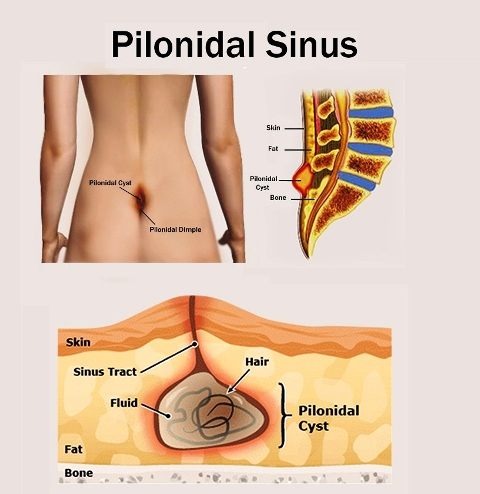 A Pilonidal sinus also called Pilonidal cyst, Pilonidal abscess or Sacrococcygeal fistula is a cyst ( small sac ) or tunnel in the skin. It develops over the tailbone at the top of the cleft of the buttocks. The cyst usually contains hair and skin debris. More than one cyst may develop and these are linked by tunnels under the skin.